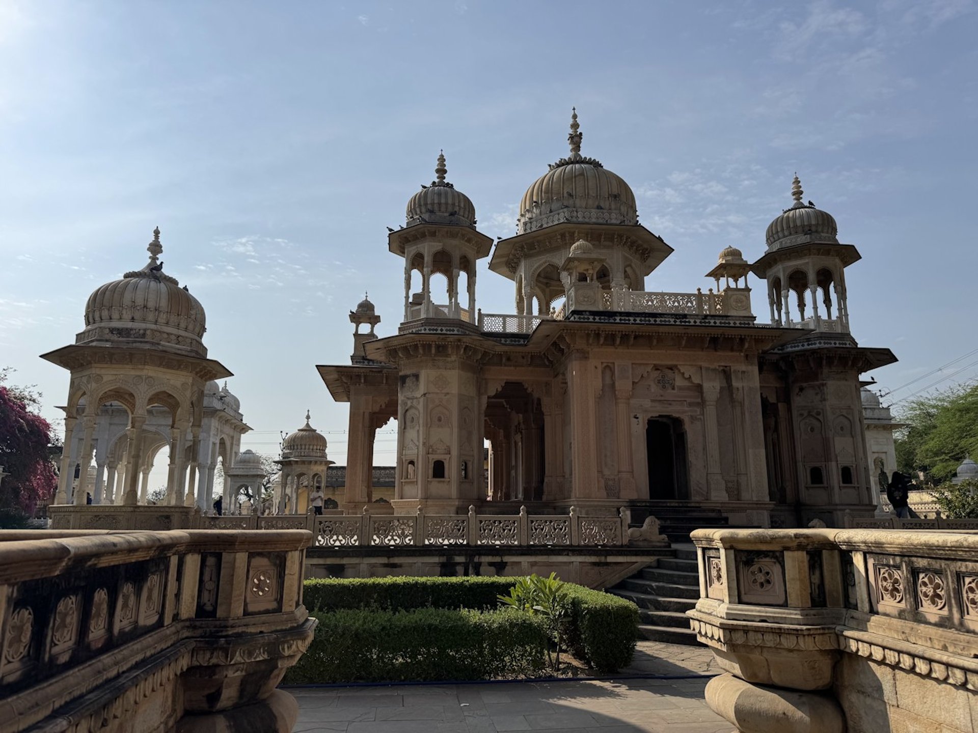 A peaceful monument adorned with intricately carved marble cenotaphs, honoring Jaipur’s former kings.